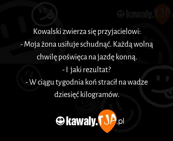 Kowalski zwierza sie przyjacielowi: - Moja zona usiluje schudnac. Kazda wolna chwile poswieca na jazde konna. - I jaki rezultat? - W ciagu tygodnia kon stracil na wadze dziesiec kilogramow.