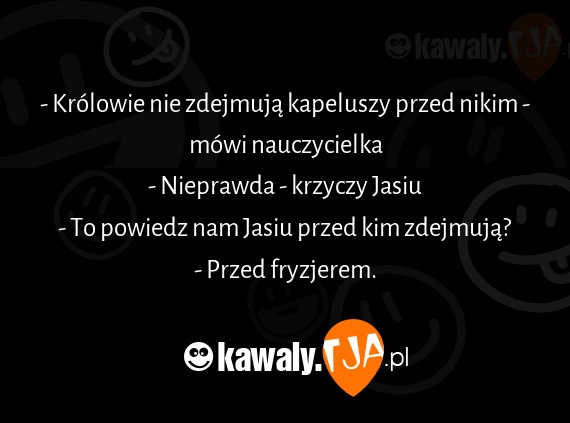 - Królowie nie zdejmują kapeluszy przed nikim - mówi nauczycielka - Nieprawda - krzyczy Jasiu - To powiedz nam Jasiu przed kim zdejmują? - Przed fryzjerem.