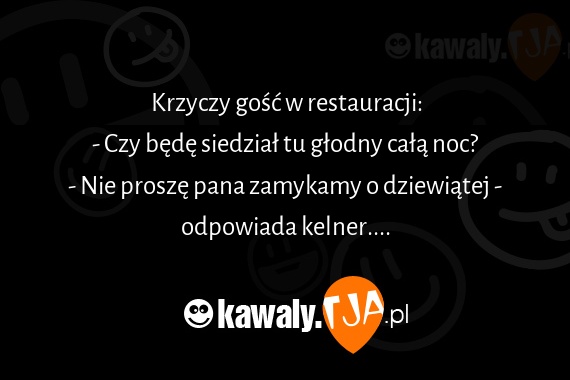 Krzyczy gosc w restauracji: - Czy bede siedzial tu glodny cala noc? - Nie prosze pana zamykamy o dziewiatej - odpowiada kelner....
