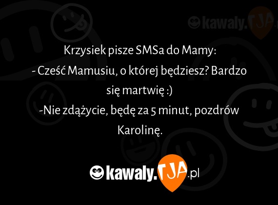 Krzysiek pisze SMSa do Mamy: - Czesc Mamusiu, o ktorej bedziesz? Bardzo sie martwie :) -Nie zdazycie, bede za 5 minut, pozdrow Karoline.