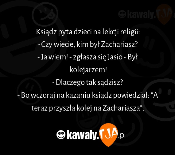 Ksiądz pyta dzieci na lekcji religii: - Czy wiecie, kim był Zachariasz? - Ja wiem! - zgłasza się Jasio - Był kolejarzem! - Dlaczego tak sądzisz? - Bo wczoraj na kazaniu ksiądz powiedział: "A teraz przyszła kolej na Zachariasza".