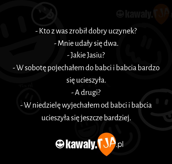 - Kto z was zrobił dobry uczynek? - Mnie udały się dwa. - Jakie Jasiu? - W sobotę pojechałem do babci i babcia bardzo się ucieszyła. - A drugi? - W niedzielę wyjechałem od babci i babcia ucieszyła się jeszcze bardziej.