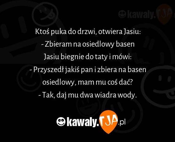 Ktoś puka do drzwi, otwiera Jasiu: - Zbieram na osiedlowy basen Jasiu biegnie do taty i mówi: - Przyszedł jakiś pan i zbiera na basen osiedlowy, mam mu coś dać? - Tak, daj mu dwa wiadra wody.