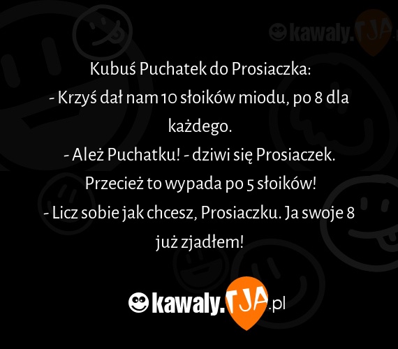Kubuś Puchatek do Prosiaczka: - Krzyś dał nam 10 słoików miodu, po 8 dla każdego. - Ależ Puchatku! - dziwi się Prosiaczek. Przecież to wypada po 5 słoików! - Licz sobie jak chcesz, Prosiaczku. Ja swoje 8 już zjadłem!