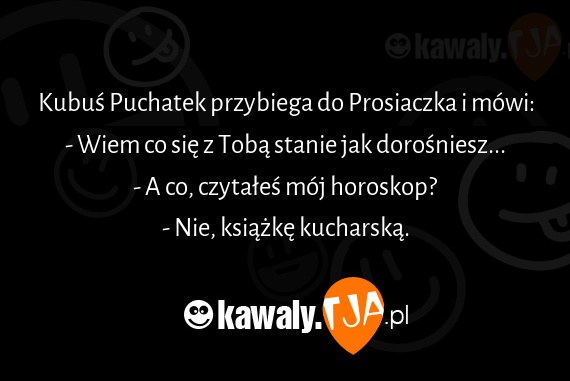 Kubus Puchatek przybiega do Prosiaczka i mowi: - Wiem co sie z Toba stanie jak dorosniesz... - A co, czytales moj horoskop? - Nie, ksiazke kucharska.