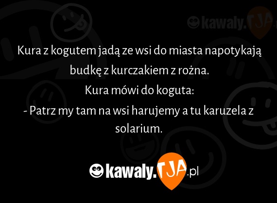 Kura z kogutem jada ze wsi do miasta napotykaja budke z kurczakiem z rozna. Kura mowi do koguta: - Patrz my tam na wsi harujemy a tu karuzela z solarium.