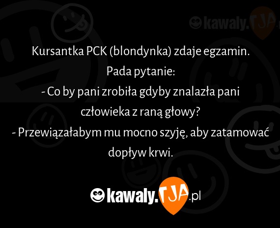 Kursantka PCK (blondynka) zdaje egzamin. Pada pytanie: - Co by pani zrobiła gdyby znalazła pani człowieka z raną głowy? - Przewiązałabym mu mocno szyję, aby zatamować dopływ krwi.