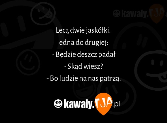 Lecą dwie jaskółki. edna do drugiej: - Będzie deszcz padał - Skąd wiesz? - Bo ludzie na nas patrzą.