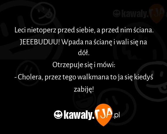 Leci nietoperz przed siebie, a przed nim ściana. JEEEBUDUU! Wpada na ścianę i wali się na dół. Otrzepuje się i mówi: - Cholera, przez tego walkmana to ja się kiedyś zabiję!