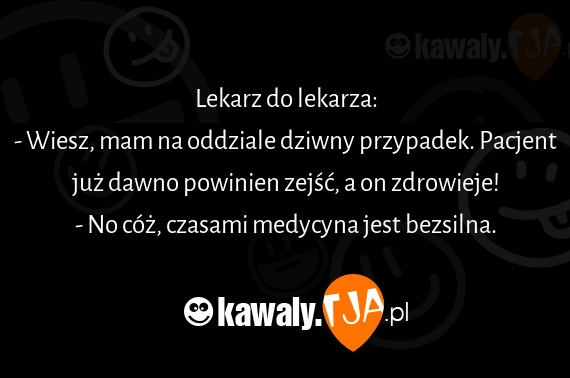 Lekarz do lekarza: - Wiesz, mam na oddziale dziwny przypadek. Pacjent juz dawno powinien zejsc, a on zdrowieje! - No coz, czasami medycyna jest bezsilna.