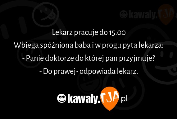 Lekarz pracuje do 15.00 Wbiega spóźniona baba i w progu pyta lekarza: - Panie doktorze do której pan przyjmuje? - Do prawej- odpowiada lekarz.