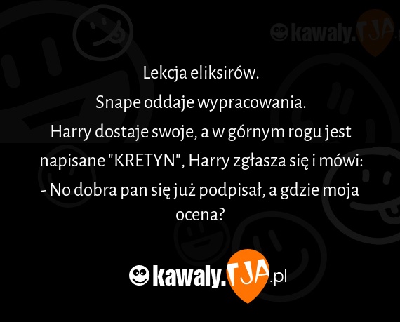 Lekcja eliksirow. Snape oddaje wypracowania. Harry dostaje swoje, a w gornym rogu jest napisane "KRETYN", Harry zglasza sie i mowi: - No dobra pan sie juz podpisal, a gdzie moja ocena?