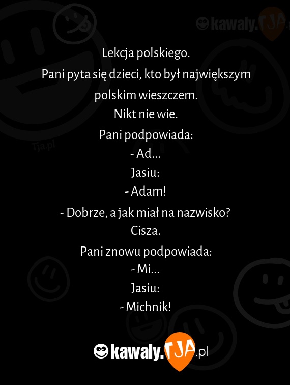 Lekcja polskiego. Pani pyta się dzieci, kto był największym polskim wieszczem. Nikt nie wie. Pani podpowiada: - Ad... Jasiu: - Adam! - Dobrze, a jak miał na nazwisko? Cisza. Pani znowu podpowiada: - Mi... Jasiu: - Michnik!