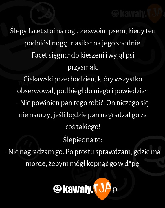 Ślepy facet stoi na rogu ze swoim psem, kiedy ten podniósł nogę i nasikał na jego spodnie.