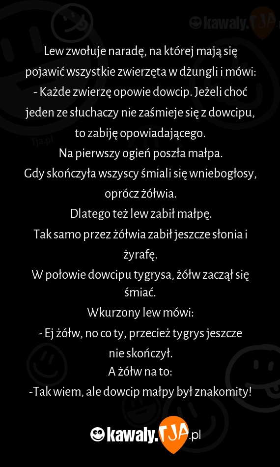 - Każde zwierzę opowie dowcip. Jeżeli choć jeden ze słuchaczy nie zaśmieje się z dowcipu, to zabiję opowiadającego.