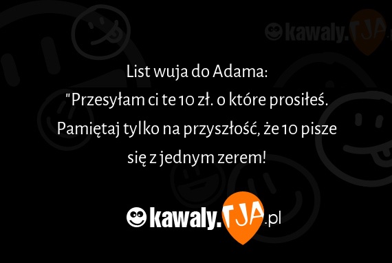 List wuja do Adama: "Przesylam ci te 10 zl. o ktore prosiles. Pamietaj tylko na przyszlosc, ze 10 pisze sie z jednym zerem!