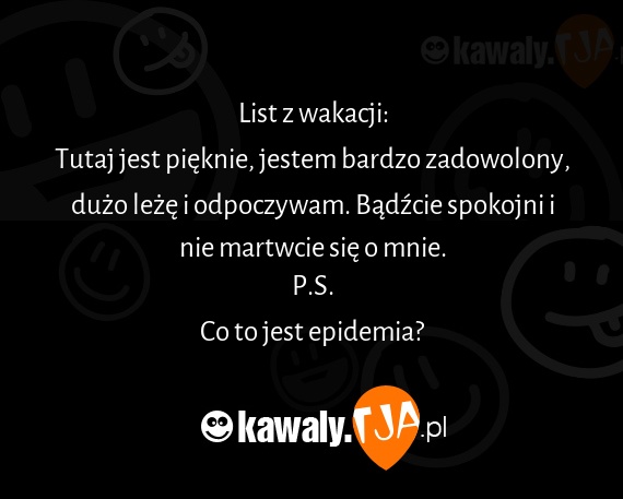 List z wakacji: Tutaj jest pięknie, jestem bardzo zadowolony, dużo leżę i odpoczywam. Bądźcie spokojni i nie martwcie się o mnie. P.S. Co to jest epidemia?