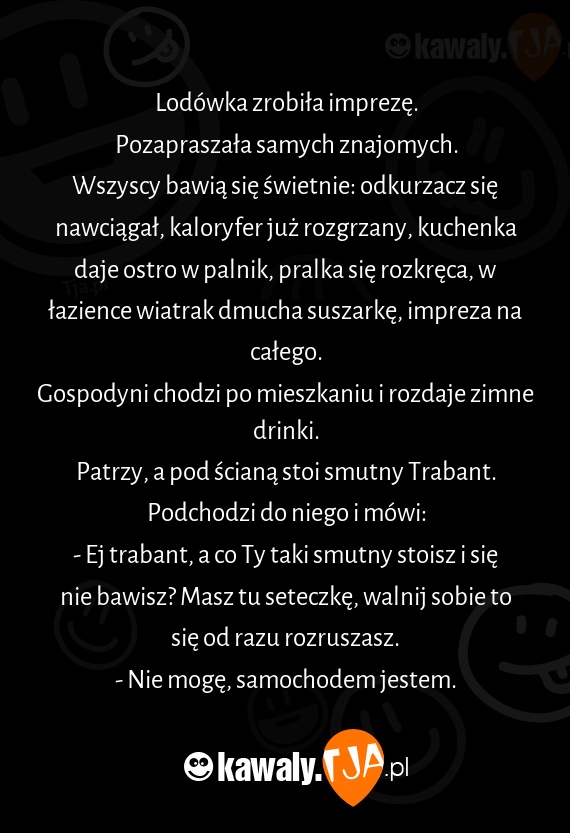 - Ej trabant, a co Ty taki smutny stoisz i się nie bawisz? Masz tu seteczkę, walnij sobie to się od razu rozruszasz.