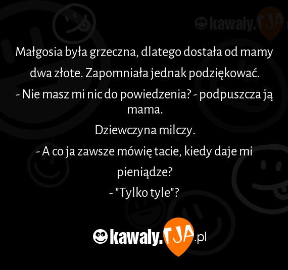 Małgosia była grzeczna, dlatego dostała od mamy dwa złote. Zapomniała jednak podziękować. - Nie masz mi nic do powiedzenia? - podpuszcza ją mama. Dziewczyna milczy. - A co ja zawsze mówię tacie, kiedy daje mi pieniądze? - "Tylko tyle"?