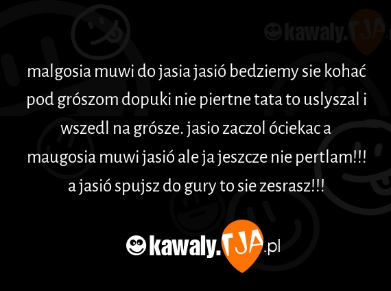 malgosia muwi do jasia jasió bedziemy sie kohać pod grószom dopuki nie piertne tata to uslyszal i wszedl na grósze. jasio zaczol óciekac a maugosia muwi jasió ale ja jeszcze nie pertlam!!! a jasió spujsz do gury to sie zesrasz!!!