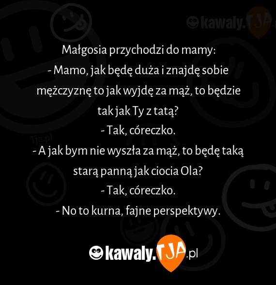 - Mamo, jak będę duża i znajdę sobie mężczyznę to jak wyjdę za mąż, to będzie tak jak Ty z tatą?