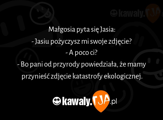 Malgosia pyta sie Jasia: - Jasiu pozyczysz mi swoje zdjecie? - A poco ci? - Bo pani od przyrody powiedziala, ze mamy przyniesc zdjecie katastrofy ekologicznej.