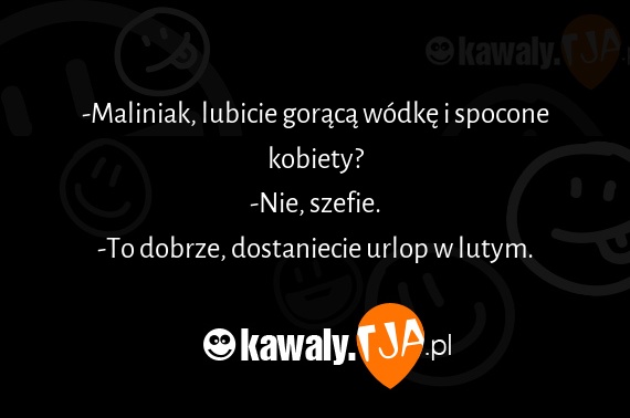 -Maliniak, lubicie goraca wodke i spocone kobiety? -Nie, szefie. -To dobrze, dostaniecie urlop w lutym.