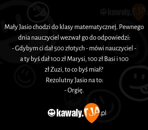 Mały Jasio chodzi do klasy matematycznej. Pewnego dnia nauczyciel wezwał go do odpowiedzi: - Gdybym ci dał 500 złotych - mówi nauczyciel - a ty byś dał 100 zł Marysi, 100 zł Basi i 100 zł Zuzi, to co byś miał? Rezolutny Jasio na to: - Orgię.