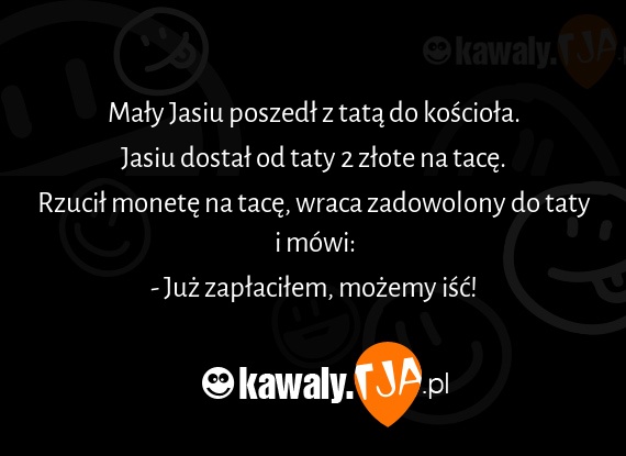 Mały Jasiu poszedł z tatą do kościoła. Jasiu dostał od taty 2 złote na tacę. Rzucił monetę na tacę, wraca zadowolony do taty i mówi: - Już zapłaciłem, możemy iść!