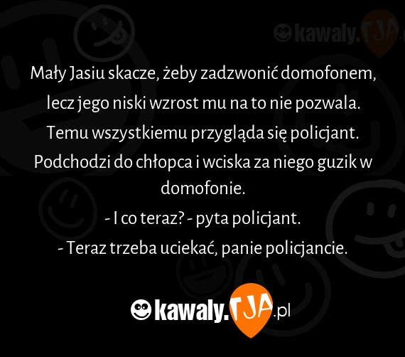 Mały Jasiu skacze, żeby zadzwonić domofonem, lecz jego niski wzrost mu na to nie pozwala.