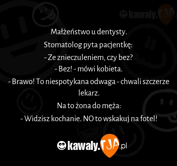 Małżeństwo u dentysty. Stomatolog pyta pacjentkę: - Ze znieczuleniem, czy bez? - Bez! - mówi kobieta. - Brawo! To niespotykana odwaga - chwali szczerze lekarz. Na to żona do męża: - Widzisz kochanie. NO to wskakuj na fotel!