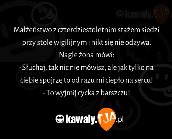 Małżeństwo z czterdziestoletnim stażem siedzi przy stole wigilijnym i nikt się nie odzywa. Nagle żona mówi: - Słuchaj, tak nic nie mówisz, ale jak tylko na ciebie spojrzę to od razu mi ciepło na sercu! - To wyjmij cycka z barszczu!