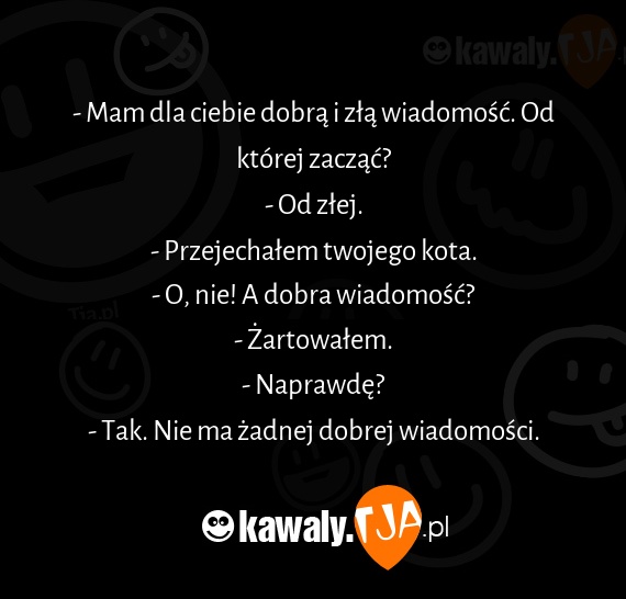 - Mam dla ciebie dobrą i złą wiadomość. Od której zacząć? - Od złej. - Przejechałem twojego kota. - O, nie! A dobra wiadomość? - Żartowałem. - Naprawdę? - Tak. Nie ma żadnej dobrej wiadomości.