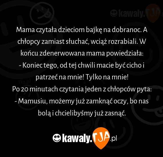 Mama czytała dzieciom bajkę na dobranoc. A chłopcy zamiast słuchać, wciąż rozrabiali. W końcu zdenerwowana mama powiedziała: