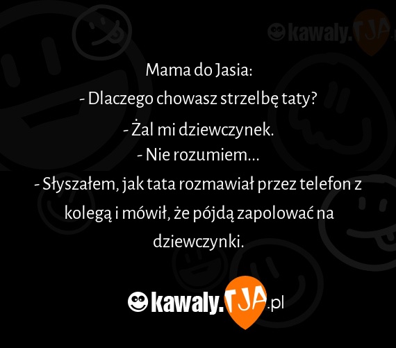 Mama do Jasia: - Dlaczego chowasz strzelbe taty? - Zal mi dziewczynek. - Nie rozumiem... - Slyszalem, jak tata rozmawial przez telefon z kolega i mowil, ze pojda zapolowac na dziewczynki.