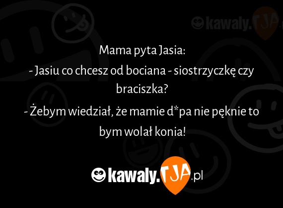 Mama pyta Jasia: - Jasiu co chcesz od bociana - siostrzyczke czy braciszka? - Zebym wiedzial, ze mamie d*pa nie peknie to bym wolal konia!