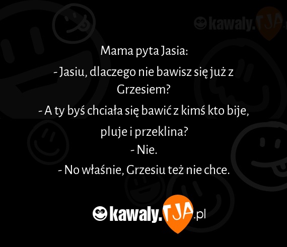 Mama pyta Jasia: - Jasiu, dlaczego nie bawisz sie juz z Grzesiem? - A ty bys chciala sie bawic z kims kto bije, pluje i przeklina? - Nie. - No wlasnie, Grzesiu tez nie chce.