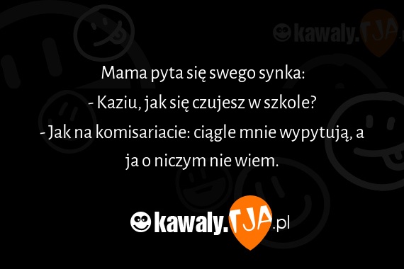 Mama pyta sie swego synka: - Kaziu, jak sie czujesz w szkole? - Jak na komisariacie: ciagle mnie wypytuja, a ja o niczym nie wiem.