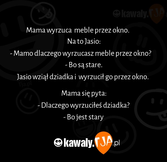 Mama wyrzuca meble przez okno. Na to Jasio: - Mamo dlaczego wyrzucasz meble przez okno? - Bo sa stare. Jasio wzial dziadka i wyrzucil go przez okno. Mama sie pyta: - Dlaczego wyrzuciles dziadka? - Bo jest stary