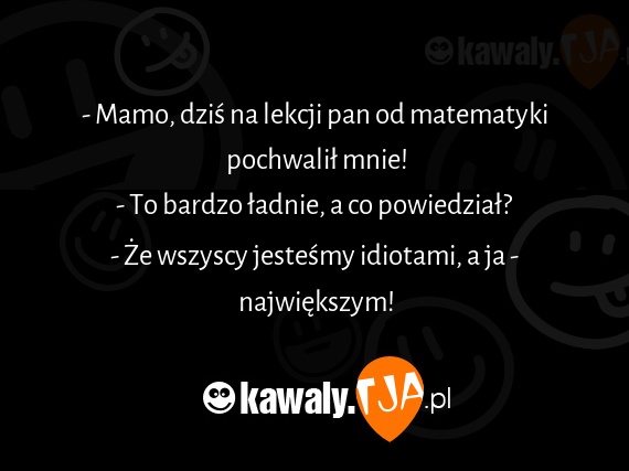 - Mamo, dziś na lekcji pan od matematyki pochwalił mnie! - To bardzo ładnie, a co powiedział? - Że wszyscy jesteśmy idiotami, a ja - największym!