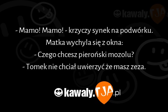 - Mamo! Mamo! - krzyczy synek na podwórku. Matka wychyla się z okna: - Czego chcesz pieroński mozolu? - Tomek nie chciał uwierzyć że masz zeza.