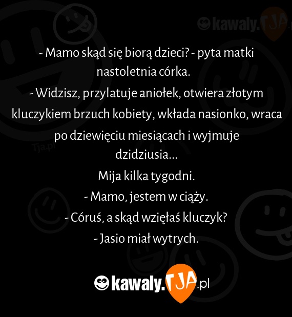- Mamo skad sie biora dzieci? - pyta matki nastoletnia corka. - Widzisz, przylatuje aniolek, otwiera zlotym kluczykiem brzuch kobiety, wklada nasionko, wraca po dziewieciu miesiacach i wyjmuje dzidziusia... Mija kilka tygodni. - Mamo, jestem w ciazy. - Corus, a skad wzielas kluczyk? - Jasio mial wytrych.