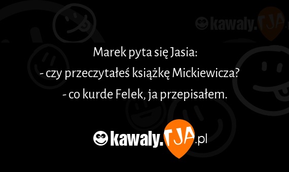 Marek pyta się Jasia: - czy przeczytałeś książkę Mickiewicza? - co kurde Felek, ja przepisałem.