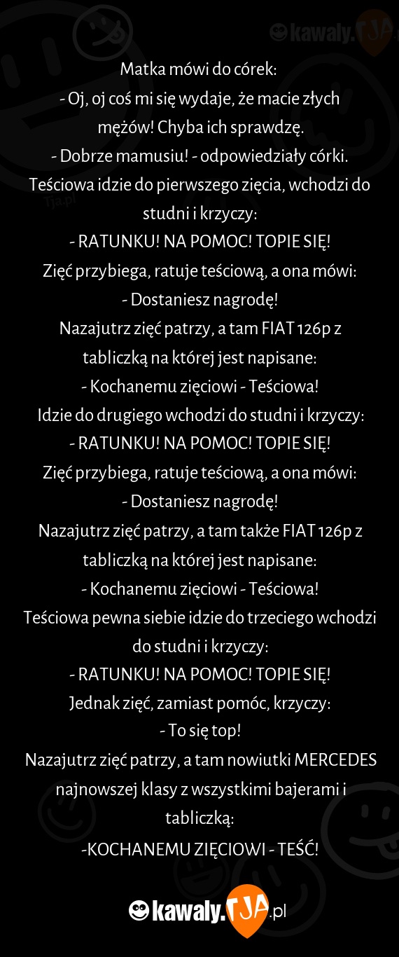 Teściowa idzie do pierwszego zięcia, wchodzi do studni i krzyczy: