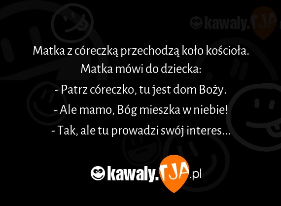 Matka z coreczka przechodza kolo kosciola. Matka mowi do dziecka: - Patrz coreczko, tu jest dom Bozy. - Ale mamo, Bog mieszka w niebie! - Tak, ale tu prowadzi swoj interes...