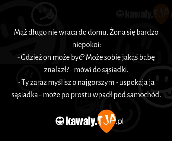 Mąż długo nie wraca do domu. Żona się bardzo niepokoi: - Gdzież on może być? Może sobie jakąś babę znalazł? - mówi do sąsiadki. - Ty zaraz myślisz o najgorszym - uspokaja ja sąsiadka - może po prostu wpadł pod samochód.