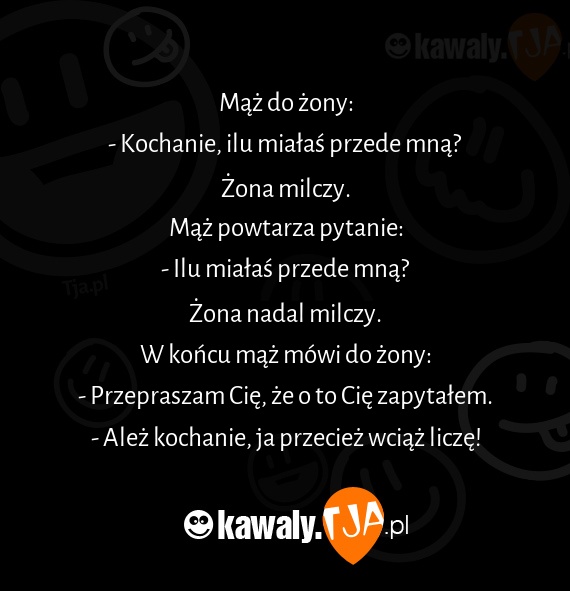 Mąż do żony: - Kochanie, ilu miałaś przede mną? Żona milczy. Mąż powtarza pytanie: - Ilu miałaś przede mną? Żona nadal milczy. W końcu mąż mówi do żony: - Przepraszam Cię, że o to Cię zapytałem. - Ależ kochanie, ja przecież wciąż liczę!