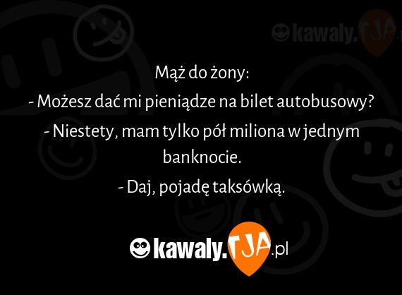 Mąż do żony: - Możesz dać mi pieniądze na bilet autobusowy? - Niestety, mam tylko pół miliona w jednym banknocie. - Daj, pojadę taksówką.