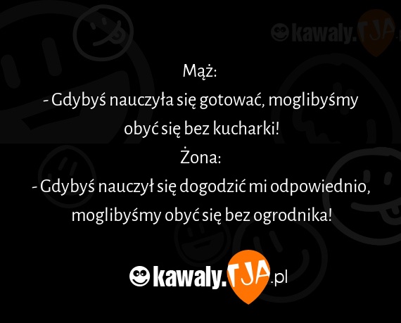 Mąż: - Gdybyś nauczyła się gotować, moglibyśmy obyć się bez kucharki! Żona: - Gdybyś nauczył się dogodzić mi odpowiednio, moglibyśmy obyć się bez ogrodnika!