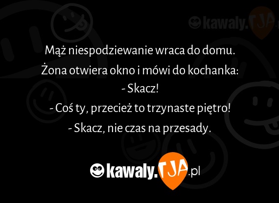 Maz niespodziewanie wraca do domu. Zona otwiera okno i mowi do kochanka: - Skacz! - Cos ty, przeciez to trzynaste pietro! - Skacz, nie czas na przesady.